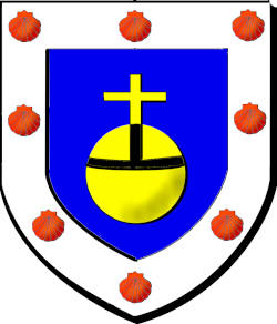 d'azur à un monde croisé d'or, cintré de sable, à une bordure d’argent chargée de huit coquilles de gueules