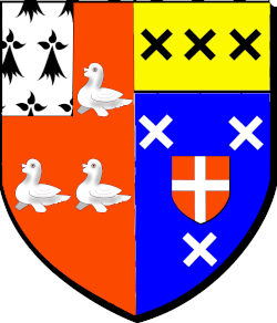 parti de gueules à quatre merlettes d'argent au franc-canton d'hermine ; et d'azur à un écusson de gueules à une croix d'argent posé en cœur, accompagnée de trois flanchis d'argent ; au chef d'or chargé de trois flanchis de sable