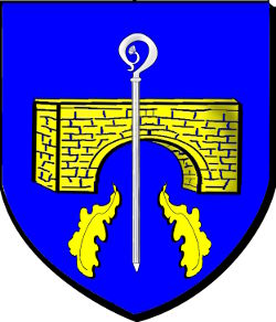 d'azur au pont à une arche alésé d'or, à une crosse d'argent brochant sur le tout accompagnée en pointe de deux feuilles de chêne d'or