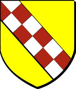 d'or à une bande échiquetée de gueules et d'argent de deux tires