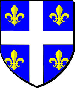 d'azur à une croix d'argent cantonnée de quatre fleurdelys