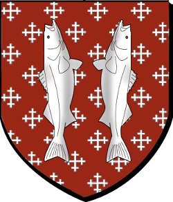 de gueules semé de croisettes recroisetées d'argent, à deux bars adossés du même brochant sur le tout