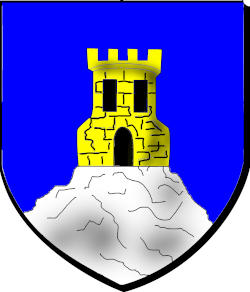 d'azur à une tour crénelée de cinq pièces d'or, bâtie sur une montagne d'argent mouvant de la pointe