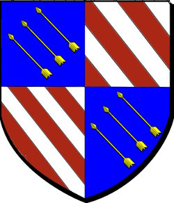 écartelé: au 1° et 4°, d'azur à trois flèches d'or, posées en bande et rangées en barre; au 2° et 3°, bandé d'argent et de gueules