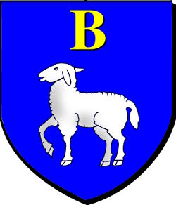 d'azur au mouton d'argent accompagné en chef d'une grande lettre B d'or