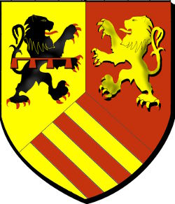 tiercé en pairle renversé: au 1°, d'or au lion contourné de sable, armé et lampassé de gueules, chargé d'un lambel de quatre pendants du même; au 2° de gueules au lion d'or; au 3°, bandé de gueules et d'or de six pièces