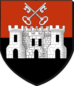 coupé de gueules et de sable, à deux clefs d'argent surmontant un château de trois tours du même, celle du centre plus petite, ouvert, ajouré et maçonné de sable, brochant sur la partition