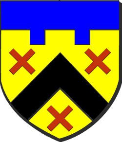 d'or au chevron de sable accompagné de trois flanchis de gueules, au chef bastillé de deux pièces d'azur