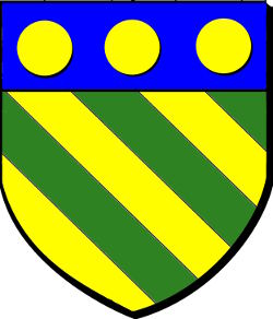 bandé de sinople et d'or, au chef d'azur chargé de trois besants d'or