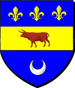 d'azur à une fasce d'or chargée d'une vache de gueules, accompagnée en chef de trois fleurdelys d'or, et en pointe d'un croissant d'argent