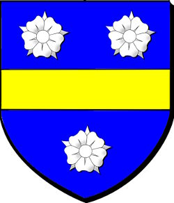 d'azur à une fasce d'or accompagnée de trois roses d'argent