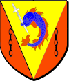 d'or au dauphin d'azur, barbé, loré, peautré de gueules, tenant dans sa gueule une épée d'argent versée en bande ; chaussé aussi de gueules à deux chaînes de sable mouvant en pal de la partition