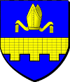 d'azur à une fasce abaissée bastillée d'or, maçonnée de sable, surmontée d'une mitre d'or