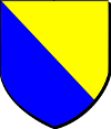 tranché de gueules plain et d'argent à quatre pals d'azur, à une cotice d'argent chargée de cinq mouchetures d'hermine posées dans le sens de la bande brochant la partition