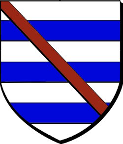 d'argent à trois fasces d'azur, à une cotice de gueules brochant sur le tout