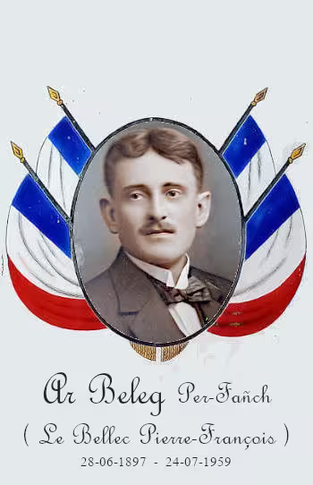 Per-Fañch ar Beleg - Pierre-François Le Bellec voit le jour le 28 juin 1897 à Koad ar C'hastell - Le Bois du Château alors ferme agréablement prospère. Un chemin mène aux corps de ferme situés sur une hauteur ; un verger sur votre droite, des labours sur votre gauche, face à vous, à quelques centaines de mètres, une longère aux portes ouvragées, un toit de chaume...