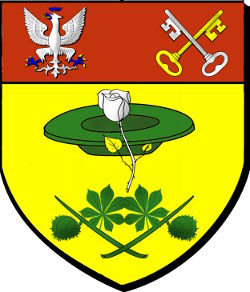 d'or à une assiette de sinople chargée d'une rose de Gautherot tigée d'argent feuillée de deux pièces du champ, soutenue de deux rameaux de marronnier passés en sautoir, chacun feuillé et fruité d'une pièce aussi de sinople, au chef de gueules chargé à dextre d'une aigle d'argent membrée et couronnée d'azur et à senestre de deux clefs, l'une d'or, l'autre d'argent, passées en sautoir