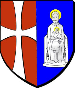 parti de gueules à une croix pattée d'argent, et d'azur à une Vierge à l'Enfant assise d'argent, le tout auréolé d'or
