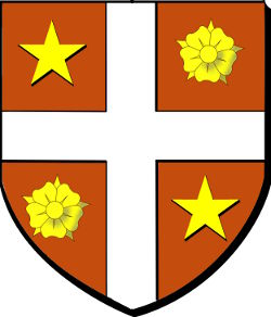 de gueules à une croix d'argent cantonnée, au premier et au quatrième, d'une étoile d'or, au deuxième et au troisième, d'une rose du même