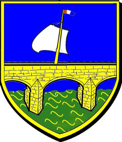 d'azur au pont d'or d'une arche et deux demies, maçonné de sable, posé sur une rivière de sinople, agitée d'or, mouvant de la pointe, sommé d'un mât d'or habillé d'argent et pavilloné en pal d'azur, d'argent et de gueules ; le tout dans une filière d'or