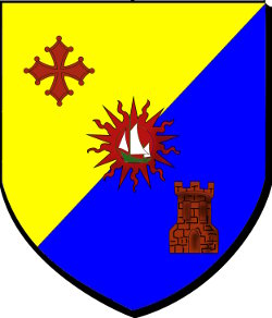 taillé : au premier d'or à une croix cléchée de gueules, au deuxième d'azur à une tour de gueules maçonnée de sable, brochant sur le tout un navire de sinople aux voiles d'argent sur un soleil de gueules