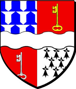 écartelé : au premier de vair de trois tires, au deuxième de gueules à une clef d'or, au troisième aussi de gueules à une clef d'argent, au quatrième d'argent aux huit mouchetures d'hermine ordonnées 3, 2 et 3 ; à une fasce ondée d'argent brochant sur la partition