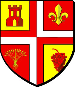 écartelé d'or et de gueules à une croix contre-écartelée de gueules et d'argent brochant sur l'écartelé, cantonnée au premier d'une tour de gueules ouverte et ajourée du champ, au deuxième d'une fleurdelys d'or, au troisième d'un faisceau rayonnant de treize épis d'or lié du même, au quatrième d'une grappe de raisin de gueules