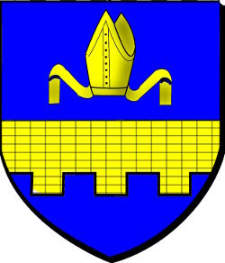 d'azur à une fasce abaissée bastillée d'or, maçonnée de sable, surmontée d'une mitre d'or