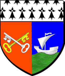 parti, de gueules à une clef d'argent posée en bande et une clé d'or brochant sur la première et posée en barre ; et d'azur à une nef d'argent, équipée et flammée du même, voguant sur une mer de sinople ; au chef d'hermine