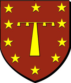 de gueules au lambel de cinq pendants d'or, celui du centre prolongé vers la pointe, accompagné de dix étoiles du même ordonnées en orle