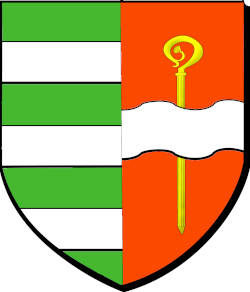 parti : au premier de sinople aux trois fasces d'argent, au second de gueules à une crosse d'or, à une fasce ondée d'argent brochant sur le tout