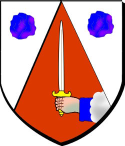 de gueules au dextrochère de carnation, vêtu d'azur, mouvant d'un nuage d'argent, tenant une épée haute d'argent garnie d'or, au chapé d'argent chargé de deux cailloux d'azur