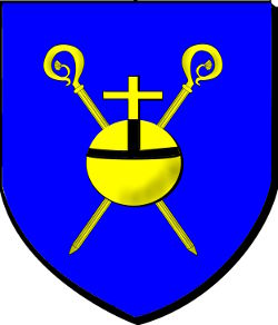 d'azur à deux crosses passées en sautoir, un monde d'or, cintré de sable et sommé d'une croix d'or brochant sur le tout
