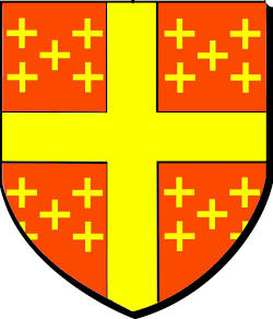 de gueules à une croix d'or chargée de cinq quintefeuilles de sinople, cantonnée de vingt croisettes d'or, cinq dans chaque canton ordonnées en sautoir