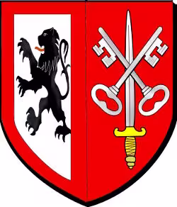 parti: d'argent au lion de sable, lampassé de gueules, à une bordure du même ; et de gueules à l'épée haute d'argent, garnie d'or, à deux clefs aussi d'argent brochants sur l'épée